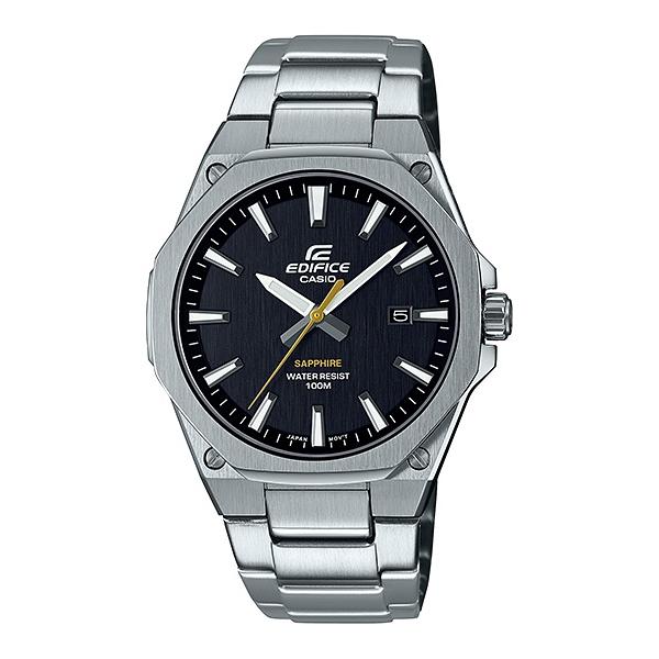 사파이어 크리스탈이 있는 EDIFICE 슬림 시리즈 | 이 시계바늘 3개의 아날로그 모델은 슬림한 7.8mm 두께의 케이스를 사용하여 착용감을 높였습니다. 이 시계는 헤어라인 마감의 평면 8각형 베젤로 스포티하면서도 고급스러운 디자인을 선보입니다. 헤어라인 마감의 다이얼로 고품질 느낌을 연출할 수도 있습니다. 케이스의 네 모서리에 있는 나사, 강력한 인덱스 디자인, 골드 초침이 스포티한 마감을 선사합니다. 스크래치 방지 사파이어 크리스털을 사용합니다.