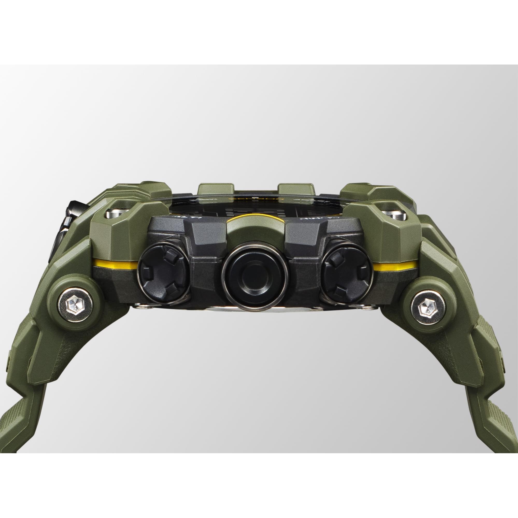 과감하고 강렬한 트리플 센서 디자인을 장착한 튼튼한 시계를 통해 한층 더 강화된 지원을 받아 더 많은 지형을 정복하세요. G-SHOCK MASTER OF G 라인의 시계는 가장 혹독한 환경 속에서 작업하는 전문가들을 위해 개발된 제품으로서 트리플 센서와 방진 구성의 MUDMAN을 도입하였습니다. 편리하게 작동할 수 있는 큼직한 전면 버튼과 측면에 위치한 세 개의 다이렉트 센서 버튼은 흙과 물을 배출하는 형태이며, 실린더 형태의 스테인리스 스틸 소재 구성 요소로 보호됩니다. 여러 개의 버튼 샤프트는 개스킷 피팅을 갖추어서 흙과 먼지가 들어오지 못하게 방지하여, 가장 혹독한 지형에 도전할 준비를 마칠 수 있게 합니다. 대담한 디자인은 이중 레이어 LCD를 갖추고 있으며, 고도, 방향, 온도 및 기압을 손목에서 바로 확인할 수 있는 트리플 센서가 특징입니다. 슬림한 모듈과 탄소 코어 가드 구조는 이런 모든 기능이 더 슬림하고 더 컴팩트한 사이즈의 워치 내에 장착되어 편안한 착용감과 함께 탄탄한 내구성을 지원한다는 것을 의미합니다. 슬림하지만 강력한 이 MUDMAN 디자인은 정교한 구성 요소의 조합으로 만들어진 매력적인 겉모습과 완벽한 기능을 한번에 갖추었습니다. 이중 레이어 LCD 덕분에 디지털 나침반은 그 어느 때보다 실용적이며, 나침반 그래픽을 상단 레이어에 표시하고 시간과 기타 측정값은 하단 레이어에 표시합니다. GW-9500-3과 GW-9500-1A4는 네거티브 이중 레이어 LCD가 특징입니다. 실용성을 새로운 차원으로 끌어 올린 무선 제어 태양광 동력은 빛으로 충전되는 정밀 시간 표시 모드와 어두운 장소에서도 가시성을 보증하는 슈퍼 일루미네이터를 선보입니다. 케이스와 베젤 및 우레탄 밴드는 재생 가능한 유기 자원에서 비롯된 바이오 기반 레진으로 제작됩니다. 케이스 뒷면에는 나침반을 들고 있는 아이코닉한 MUDMAN 두더지 캐릭터가 새겨져 있습니다.