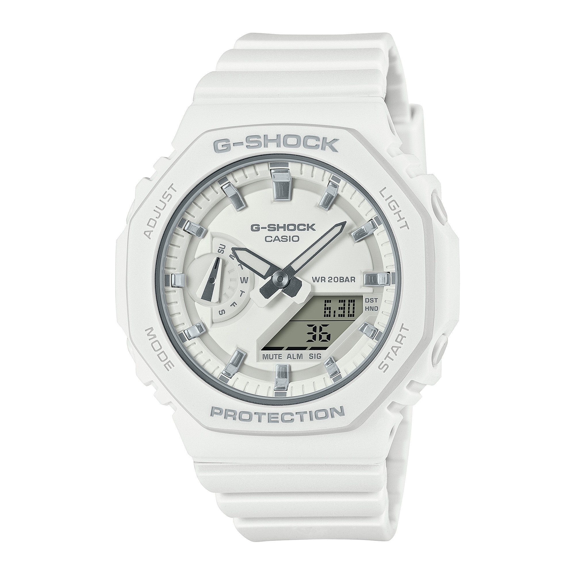끊임없이 강성을 추구하는 견고한 시계 G-SHOCK 중 인기 있는 GA-2100 모델의 다운사이즈 버전으로, 단순하고 얇은 디자인으로 견고한 구조를 유지하면서 과하지 않은 외형을 갖추었습니다. 기본 GA-2100 모델은 첫 번째 DW-5000C 모델의 팔각형을 토대로 더 얇게 만들어졌습니다. 평평한 문자반과 단순한 바 인덱스는 단순하면서도 견고한 인상을 줍니다. 컬러링은 어떤 패션에도 어울리는 매트 화이트 컬러입니다. 반짝이는 금속성 바 인덱스가 고급스러운 질감을 선사합니다.