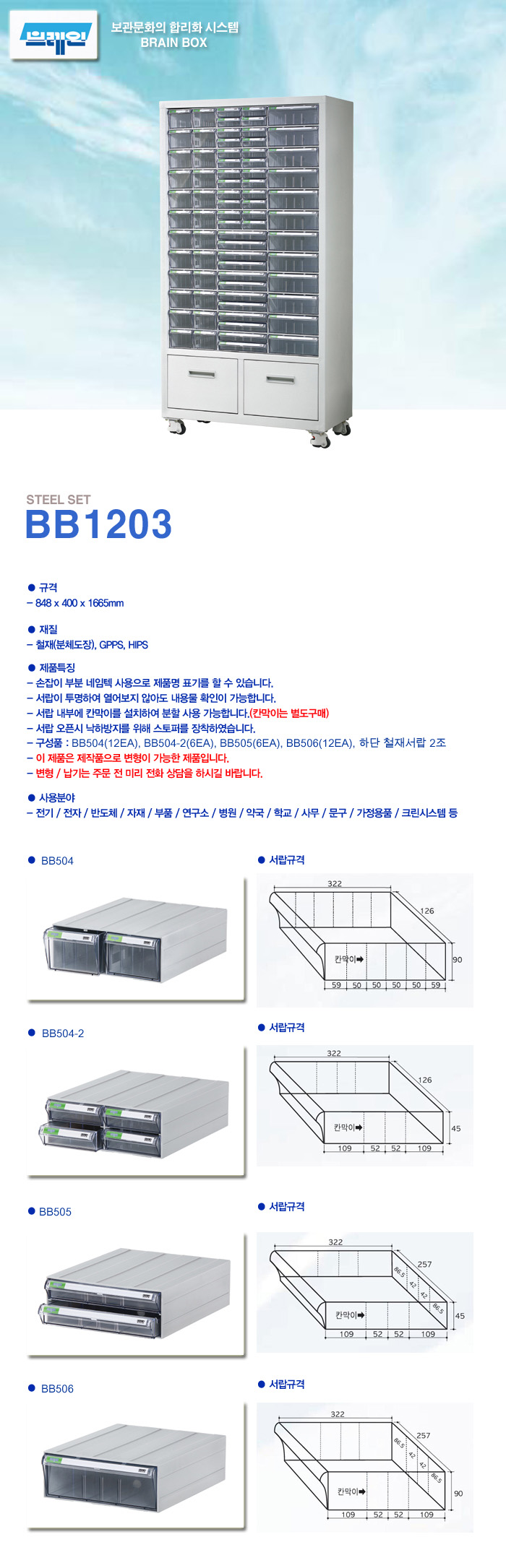 이동형/ 분체도장 제품구성 : BB504=12EA, BB504-2=6EA, BB505=6EA, BB506=12EA, 하단철재서랍2조 제품규격 : 가로872mm, 세로400mm, 높이1665mm(케스타포함)