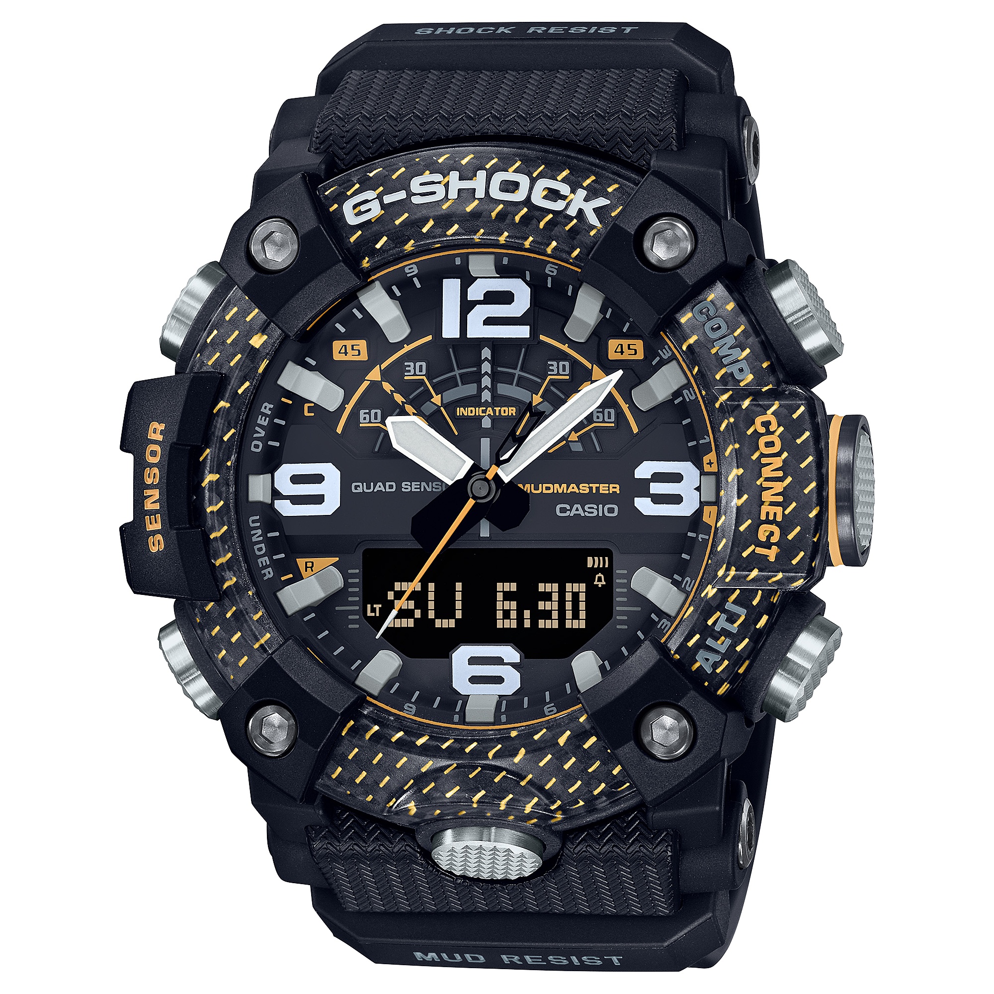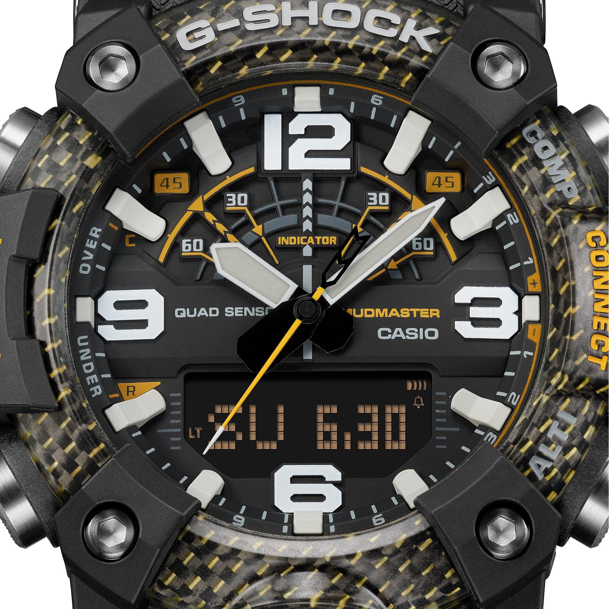 과감하고 시선을 사로잡는 색상 구조의 튼튼한 시계로 거친 지형을 정복하고 주목을 받아보세요. 가장 혹독한 환경에서도 작동하도록 설계된 MASTER of G 특수 시계는 튼튼한 디자인과 비상 구조에 사용되는 밝은 노란색이 포인트로, 시간 계측의 차원을 높여줍니다. GG-B100 MUDMASTER는 케이스에 높은 강성의 탄소를 사용해 손상 및 변형을 방지하고, 최고의 밀폐 성능과 충격 저항을 제공합니다. 이 시계에는 흙의 침입을 방지하는 필터, 스테인리스 스틸 패널 뒷면, 유리 섬유로 내장된 내충격성 미세 레진으로 만들어진 후면 커버가 있어 먼지나 진흙이 침투하지 않게 막아줍니다. 베젤도 탄소 섬유가 함유된 세 개의 미세 레진 레이어를 사용합니다. 이 튼튼하고 견고한 디자인은 밝고 대담한 노란색이 포인트입니다. 실용적이고 기능적인 이 시계에는 디지털 나침반, 고도계/기압계, 온도계 및 만보기가 장착되어 있습니다. 전용 G-SHOCK 앱을 사용하여 시간을 쉽게 수정할 수 있을 뿐 아니라, 스마트폰의 시계 및 경로 데이터에서 얻은 고도 데이터를 자동으로 앱에 기록하는 Mission Log 등 여러 가지 유용한 기능을 활용할 수 있습니다.