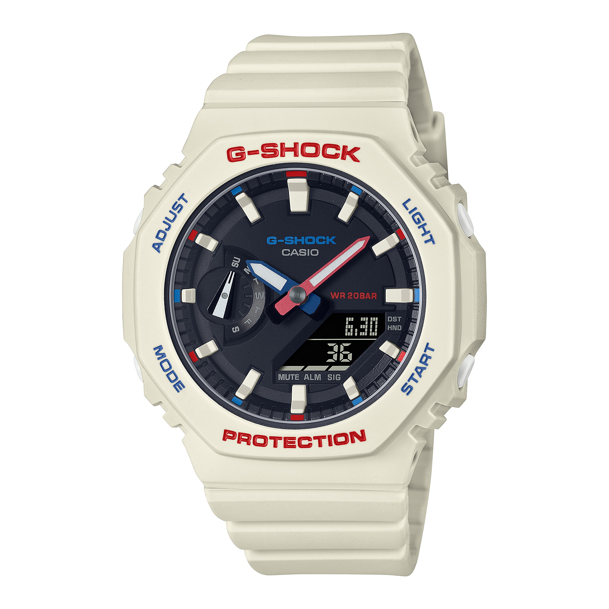 이제 눈에 띄는 삼색 디자인의 상징적인 팔각형 G-SHOCK과 함께 놀라운 겨울 세상을 즐겨 보세요. 베젤, 인덱스, 시계 바늘의 빨간색과 파란색 터치로 중성적인 흑백의 색상 배색을 강조합니다. 도시에서부터 겨울 리조트 패션에 이르기까지 모든 활동에 어울립니다. 클래식 G-SHOCK의 더 작고 얇은 프로필은 어떤 종류의 스타일에도 잘 어울립니다.